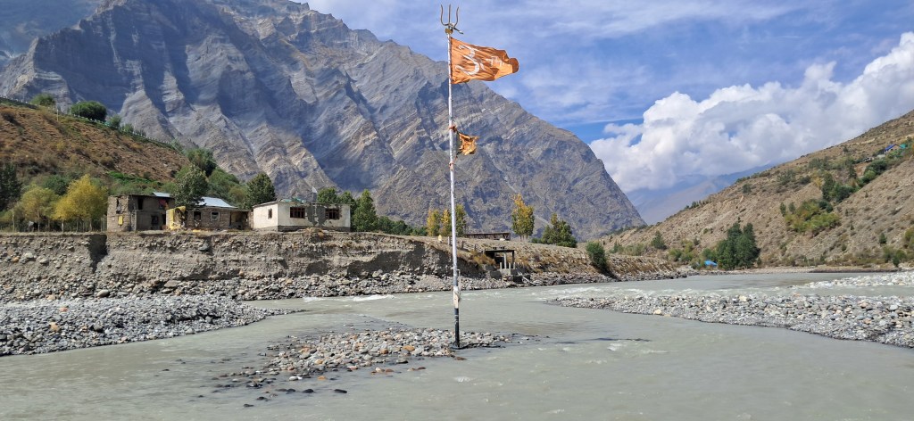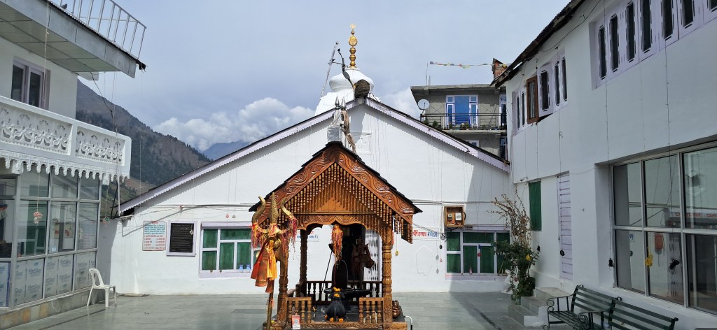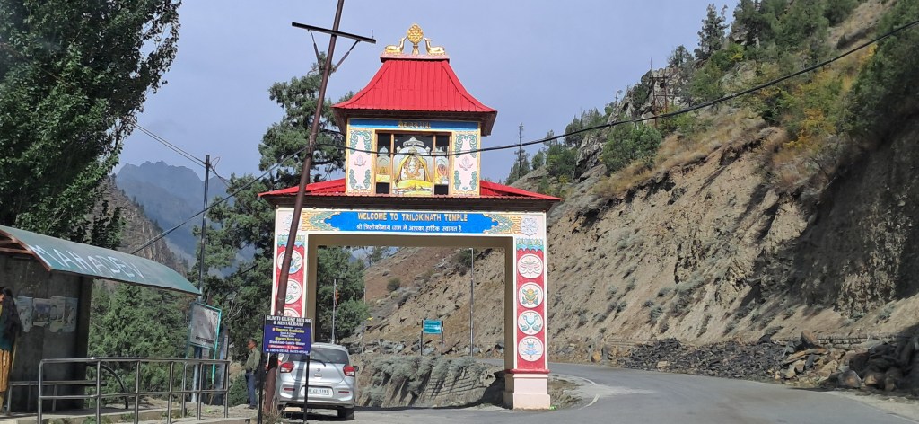We were greeted by a small, beautiful courtyard with a small Shivling, Nandi, and a Buddhist prayer wheel as we entered. Two pillars stood on either side of the main deity. It is believed that only a person who has not committed sins can pass from the sides of the pillar, a tribute to the temple’s strict adherence to purity and righteousness. These customs and beliefs instilled a sense of reverence and respect. The image of the temple’s interior was dazzling. I was rapt by the intricate carvings and the serene atmosphere. However, our time inside was brief, as the military officials guarding the temple managed the crowd efficiently. I simply couldn’t take my eyes off the magnificent statue and had to be told to leave. Triloknath is also famous for its scenic beauty. The valley, the village, and the mountains on either side of the temple were truly magnificent. Arpit, our driver, thanked me for the opportunity to drive us to Triloknath. ‘Thank you for showing me a new place. I’ve never seen this beautiful temple.’ Although he is an experienced driver who regularly drives through Kinnaur, Spiti, and the Lahaul Valley, he had never travelled here, and his excitement was apparent.