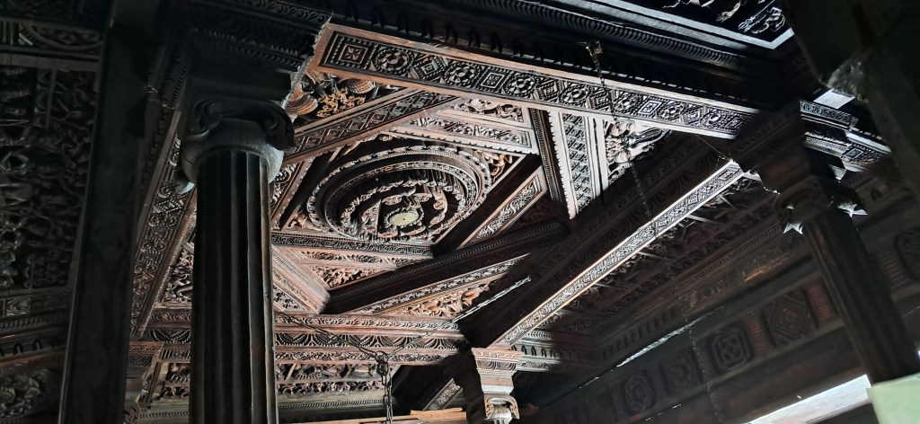 The pillars and doors are made of wood and have intricately carved designs. A lovely, wood-carved Ganesha greeted us at the temple with an open building complex. The complex has many other small temples carved from stone and ancient statues. This cedar-wood Pagoda temple reminded me of the Hidimba Devi temple of Manali. The two lower storeys are characteristically divided by wooden pillars.